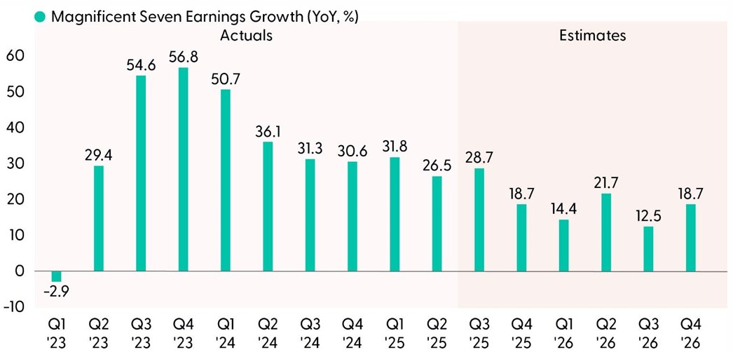Estimates may not materialize as predicted and are subject to change. Magnificent (Mag) Seven includes Alphabet (GOOG/L), Amazon (AMZN), Apple (AAPL), Meta (META), Microsoft (MSFT), NVIDIA (NVDA), and Tesla (TSLA).
