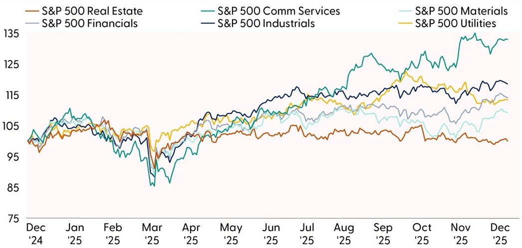 Overweighting Communication Services All Year — Big Hit. The only sector call we maintained throughout all of 2025 was a good one — overweighting communication (comm) services. The top-performing sector in 2025 for the second straight year (after gaining 55.8% to finish slightly behind tech in 2023), comm services returned 33.6% in 2025, more than 15% ahead of the S&P 500, and more than 9% ahead of the second-best sector, technology (+24.0%). A more reasonably valued play on AI with significant digital media exposure, the sector is tracking toward 19% earnings growth for 2025, and trades at a 17% discount to the technology sector. LPL’s STAAC maintained this recommendation as 2026 began.