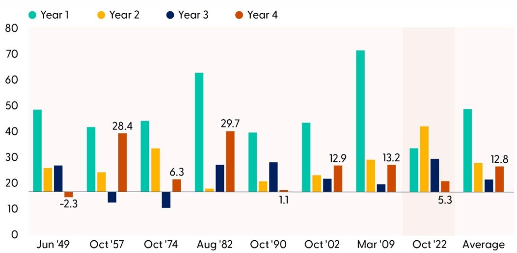 Disclosures: Only S&P 500 bull markets that made it through a fourth year are shown, in addition to the current bull market. All indexes are unmanaged and cannot be invested in directly. Past performance is no guarantee of future results. The modern design of the S&P 500 stock index was first launched in 1957. Performance back to 1950 incorporates the performance of the predecessor index, the S&P 90.