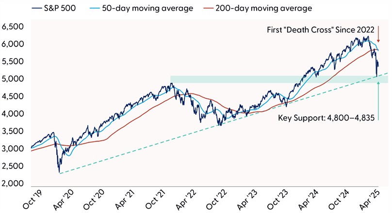 So, what is price action telling us? First, and perhaps most importantly, the longer-term uptrend for the S&P 500 remains intact. This suggests the path of least resistance from here is likely higher, but not without near-term risks. Second, a capitulation point was likely reached amid historic volatility during the week of April 7. Several items on our checklist for a durable low were checked, including (but not limited to) historically oversold conditions at the index and constituent level, washed-out readings across market breadth measures, peak fear likely being reached, and record-level trading volume. Third, evidence of a capitulation does not mean stocks will rally back to record highs or that a retest of the recent lows is off the table. While we remain open-minded to the prospect of a more V shaped recovery, underwhelming participation and the lack of cyclical leadership off the recent lows suggest there is still an elevated risk for a retest of the 4,835 low. This support zone, highlighted in the “S&P 500 Is Holding Above Key Support” chart, expanded to 4,800 to include the 2022 highs and a key retracement level from the bull market run since 2022, is essential for the S&P 500 to maintain.