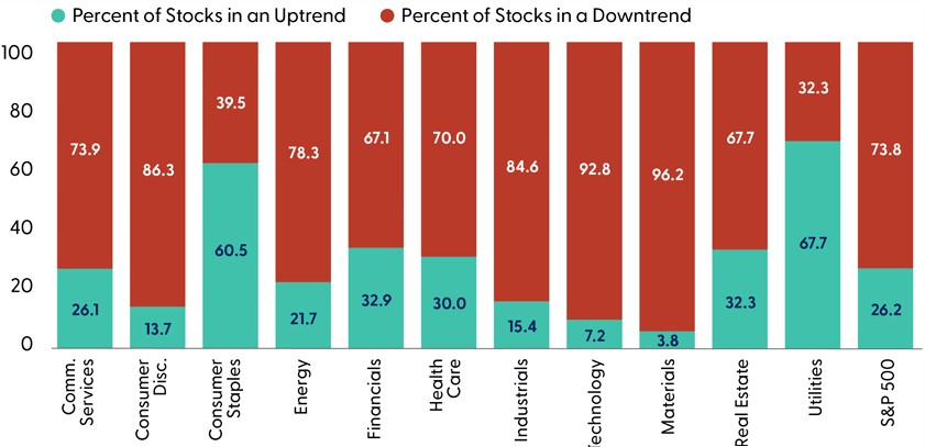 Looking underneath the hood reveals a market in much need of repair. While the S&P 500 narrowly avoided a technical bear market after recording a maximum drawdown of 18.9% on a closing basis on April 8, the average constituent is trading 23% away from a 52-week high. In addition, our trend model, highlighted in the “Technical Damage Has Been Widespread” chart, shows nearly three-quarters of S&P 500 stocks are in some form of a downtrend. The technology sector has suffered severe technical damage, with 93% of sector stocks trending lower, according to the model. Given the sector’s 30% weight in the index, we continue to believe tech sector participation (at minimum) will be required for the broader market to stage a sustainable recovery.